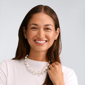These Baroque pearls are absolute stunners, full of organic curves and natural shapes. This necklace is our "one-and-done" - all you need to make a black or white tee into a full LOOK or to make your prints POP. That being said, our linking ovals clasp allows you to attach a bracelet chain to extend your strand, or a charm lock and/or charms to customize your look and make it YOURS.