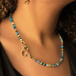 This multi-colored strand of opal beads is making us so happy this season, with it's varying shades of fiery blues, orange, teal, and white. These magical opals are strung onto a sculptural gold closure, which we like to turn to the front as an added element of interest. If you want to take this necklace to the next level, try attaching a pavé Charm Lock between the clasps, as well as a charm or few. Or simply mix these beads in with your neck mess to bring some color and magic to your jewelry look.