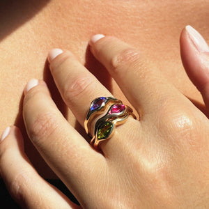 We can't get enough of these rings - wear them alone, in a stack, or to modernize an otherwise traditional wedding band or engagement ring. These extra special ripple rings feature a gorgeous, colored gemstone.