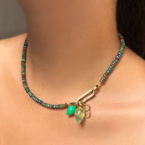 Green faceted opals with a 14k gold Safety Pin charm lock.