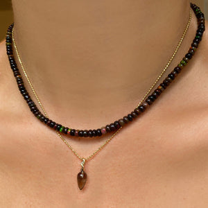 Glowing opal beads are strung onto a 14k gold linking oval closure.  Mix these beads in with your neck mess to bring some color and magic to your jewelry look, or make them the star of the show.