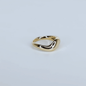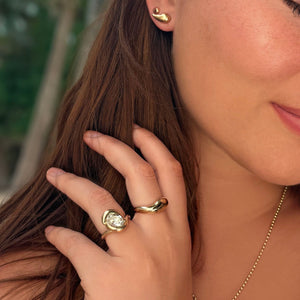A sculptural, molten 14k recycled yellow gold ring. This organic piece is elegant yet substantial. Wear it as a unique wedding band or simply a striking addition to your ring collection.